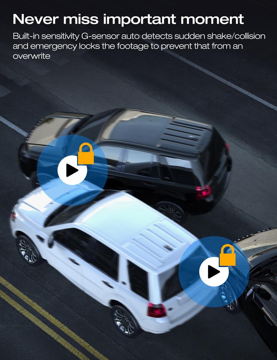 The dash camera comes with a 12V-24V Hardwire Kit to realize 24H parking monitoring. After the car is turned off, the built-in gravity sensor realizes the automatic boot recording after the vehicle is shaken, which continues to guard the car.