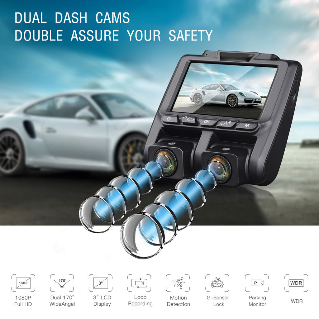 With 3 inch LCD screen, the dual dash cam for cars simultaneously records both front & inside. The dash cam front and rear simultaneously capture the road front and inside passenger cabin at dual 1920x1080P, capture every detail in front and inside of the vehicle while driving. Best choice for online car-hailing service, taxis/rideshare drivers, commuters, and families.