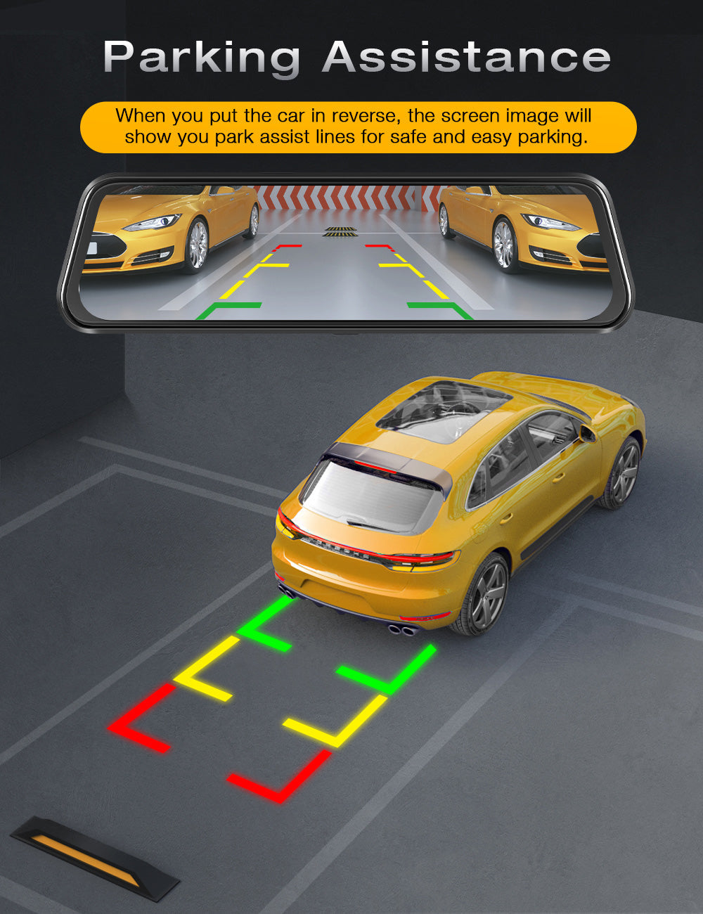 With a parking system, the Mirror Dash Cam will automatically switch to the rear camera screen (Note: Please connect the red line of the rear camera to the reversing lights) and will display park assist lines for safe and easy parking, giving you a full sense of security.