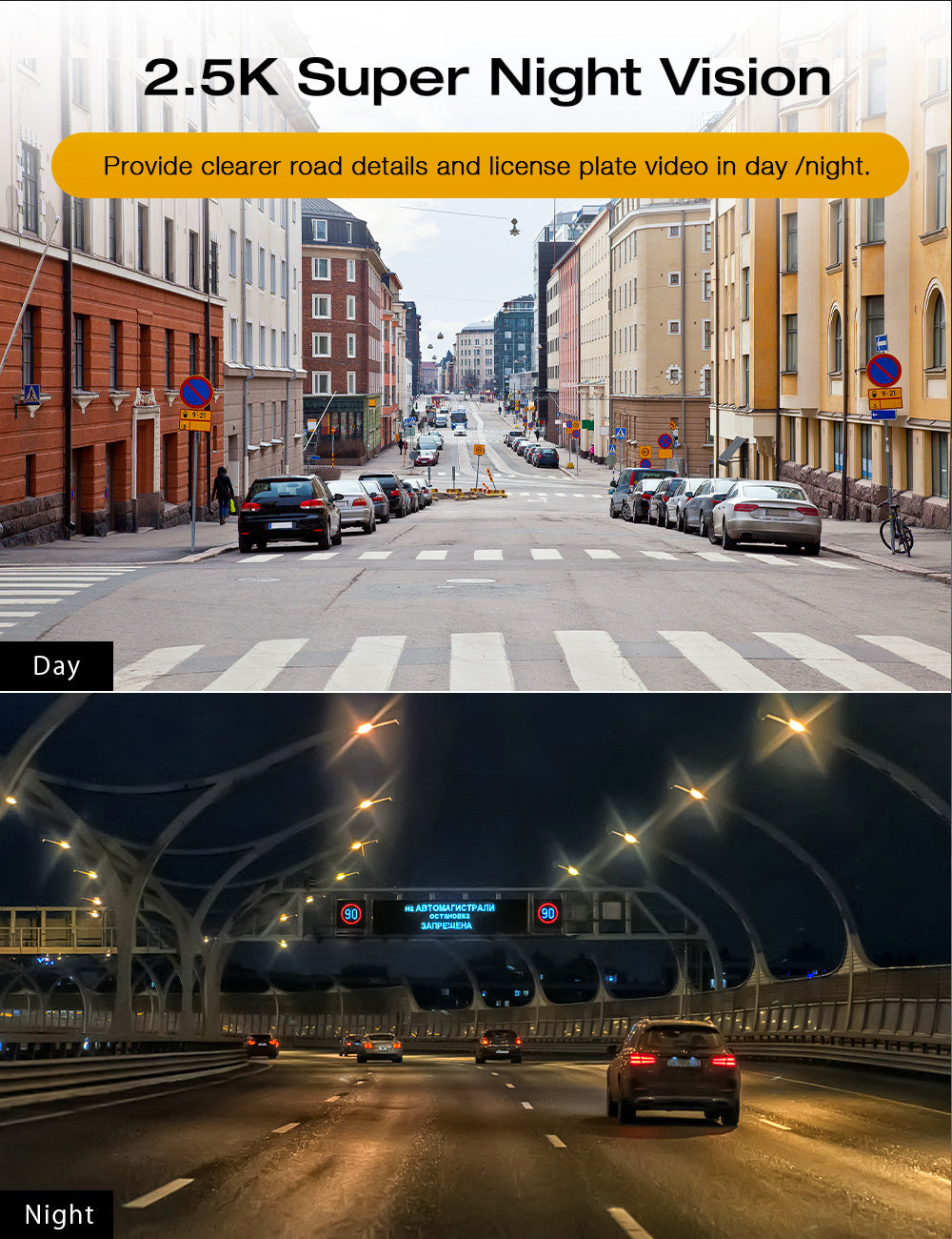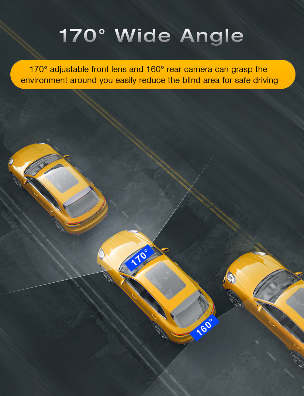 The front lens can be adjustable manually. The front camera 2K (2560 x 1440P) has a 170° wide-angle, and can clearly display license plates or road signs in the distance.