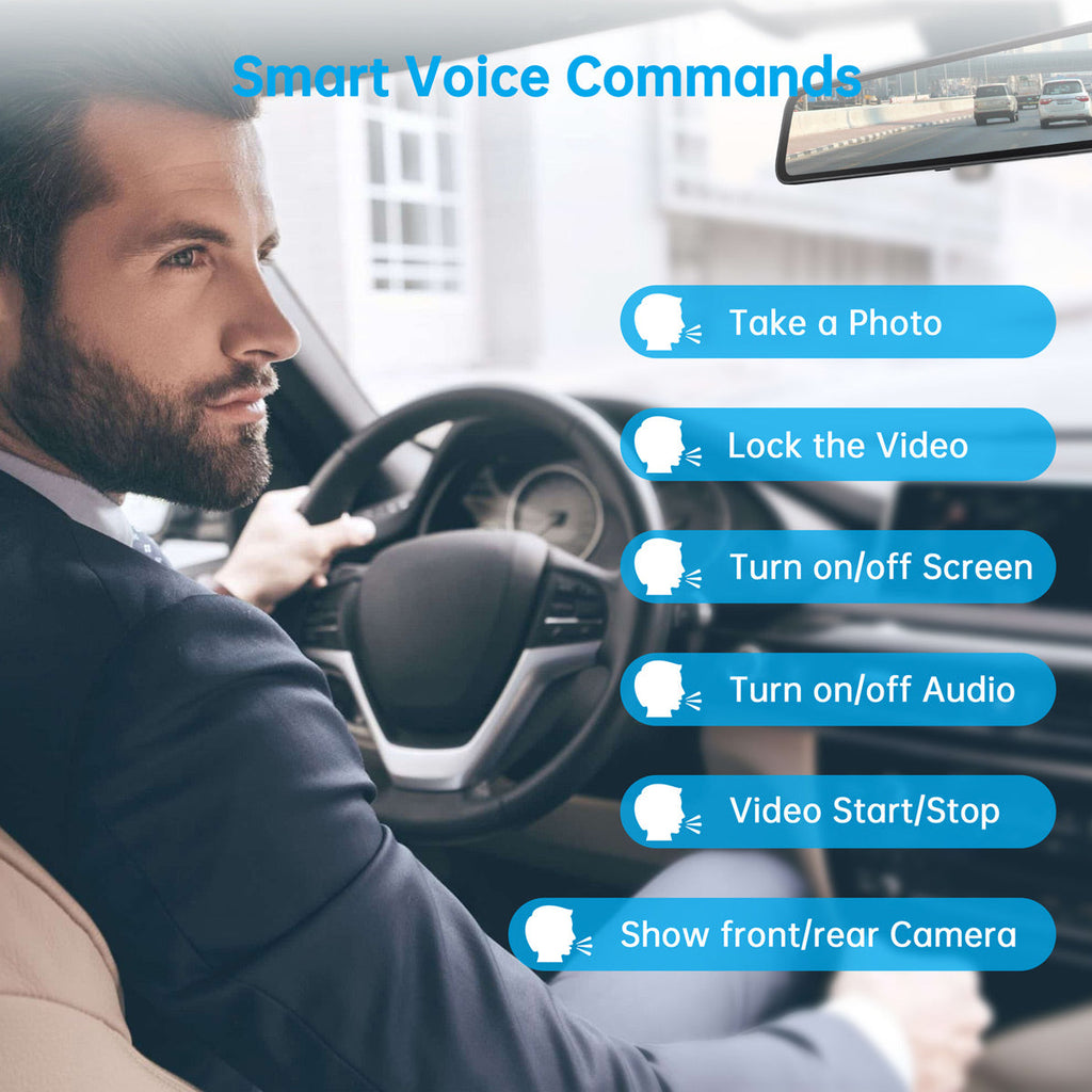 【Touch Screen & Smart Voice Control】With user-friendly touch operation interface, you'll find the mirror camera is quite easy to use. If you are busy driving, you just give it a voice command, it listens and works, like turn on/off screen, lock video, start/stop recording, switch cameras, etc. The upgraded voice control system will surely free your hand and add ease and safety to your journey.