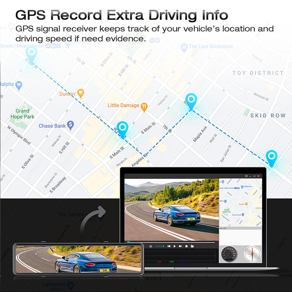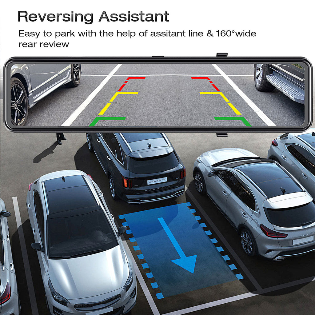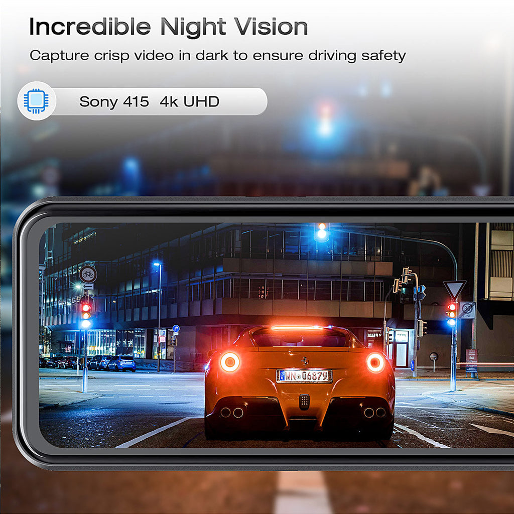 - 【4K+1080P Dash Cam Front and Rear】 - Features 4K UHD resolution, this mirror dash cam captures clear license plates front and rear your vehicle. The big 12" screen is easy to switch front/rear and both camera angle of view. This rear view mirror camera provide you 100% worry-free while driving.