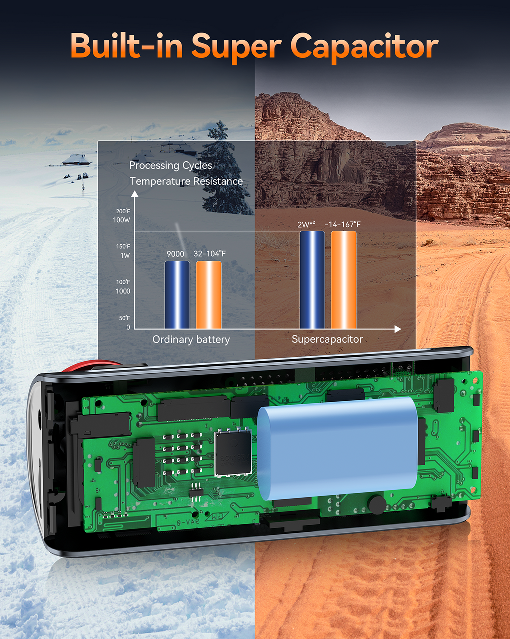 Built-in super capacitor is resistant to heat damage, it will work stable in summer and winter without overheating,explosion and melting.