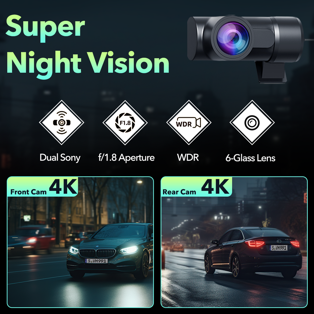 【High-quality Image Sensor】This front and rear driving recorder has an 8-megapixel camera equipped with a high-quality Sony sensor and F1.8 large aperture, providing clear and delicate image quality, especially in low-light environments, it can restore more details. Using professional WDR and HDR technology, it will automatically improve and increase the exposure in dark environments, ensuring that clear videos can be captured in the dark.
