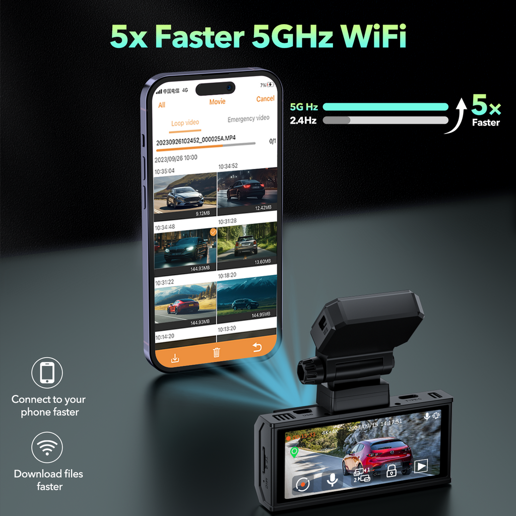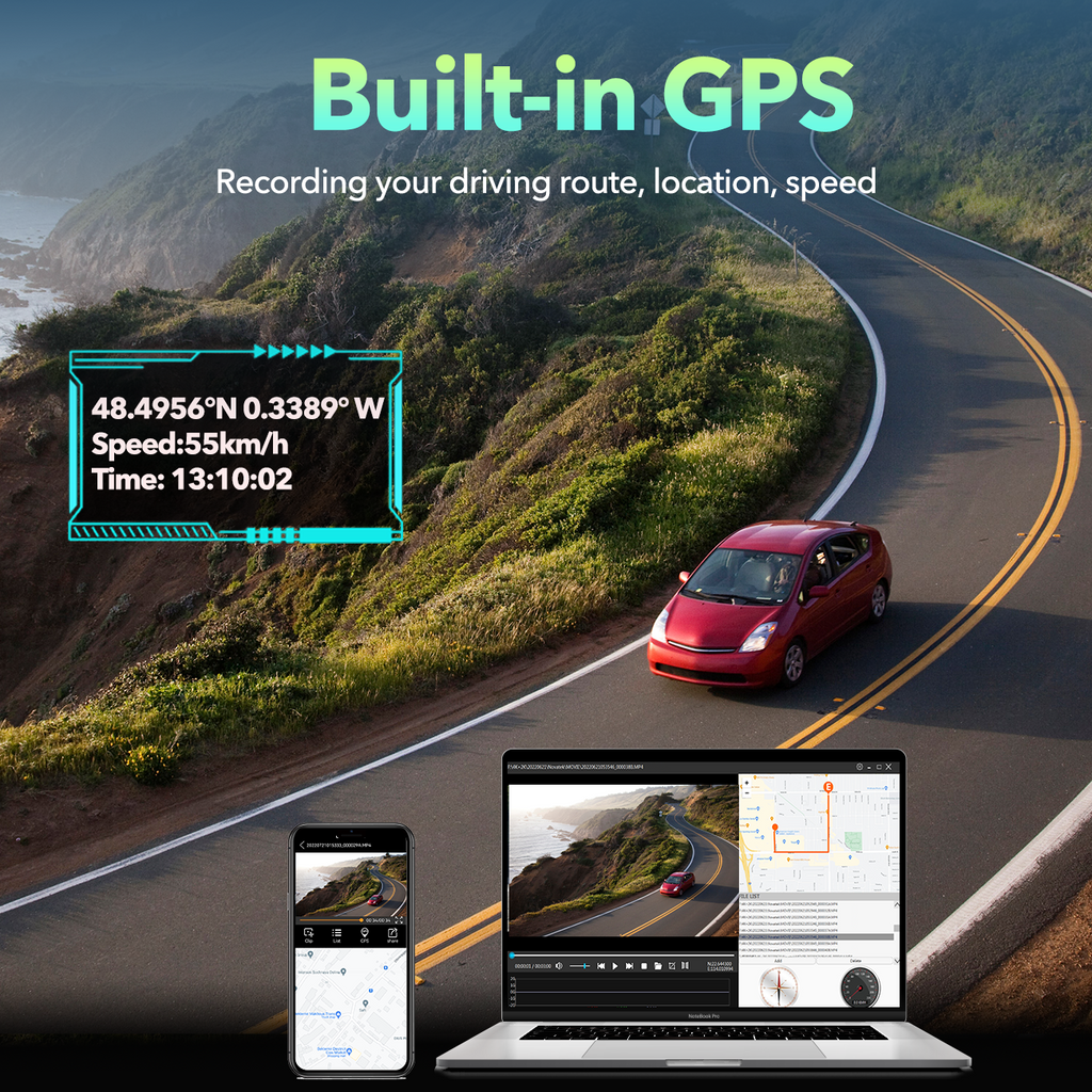 【5GHz WiFi and GPS Tracking】Features a faster 5GHz WiFi connection for fast viewing, downloading and sharing of videos with free apps. The built-in GPS real-time positioning function displays the route and driving speed, allowing you to understand road conditions in real time.