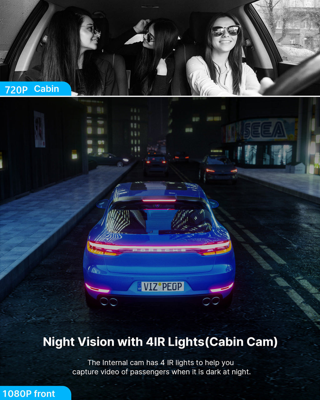 【Super Infrared Night Vision】1080P recording and HDR technology, the image, and video qualities are still clear and detailed even at night. In addition, the interior car cam is capable of capturing clear video in the dark with 4 infrared (IR) lights. This is well suited for taxi drivers who are mainly on the road late at night