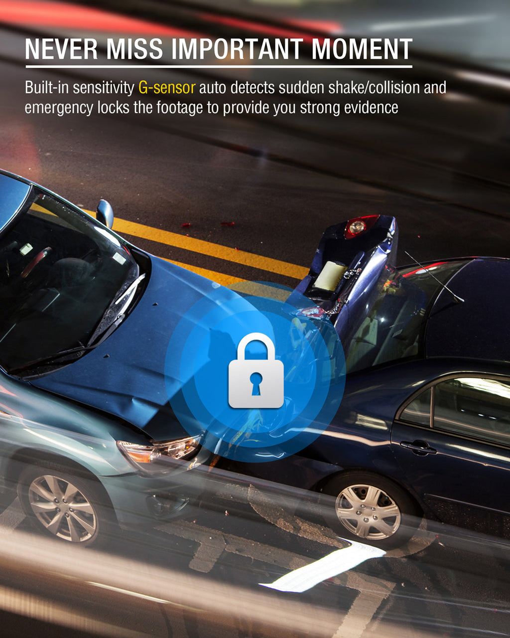 The dash camera for the car will automatically power on to record inside and front when detecting a sudden bump or impact to the car, which keeps an extra eye on your car while parked.