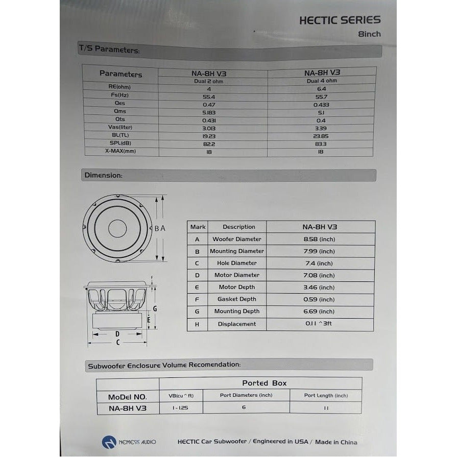 1800 Watts Peak 900 Watts RMSDual 4-Ohm ImpedanceHeavy Duty Cast BasketNon-Pressed Paper ConeFoam Surround2.75′- 4 Layer CCA Wire Voice Coil3pcs High-Efficiency Y35 Magnets Total 210 OZTinsel Woven Leads on Nomex Spider